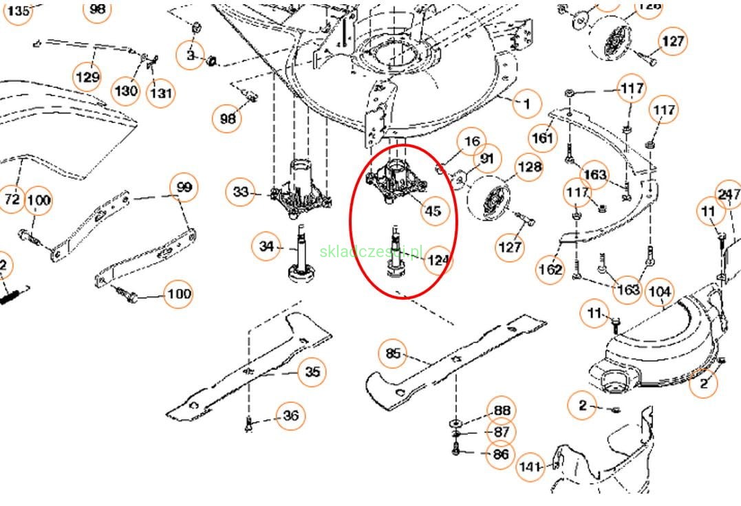 Mandrela kompletna z wałkiem, piasta adapter noża prawy niski na 4 śruby do traktorka kosiarki