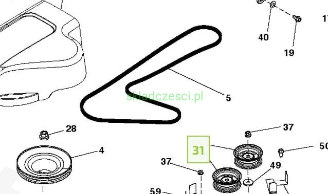 Część ta (napinacz paska) pełni funkcję rolki napinającej paska klinowego, zazwyczaj w systemie napędu noży lub rzadziej napędu jazdy (w zależności od konkretnego modelu maszyny). Jest to kluczowy element dla prawidłowego działania układu napędowego (paska) w wielu modelach kosiarek i traktorków ogrodowych.